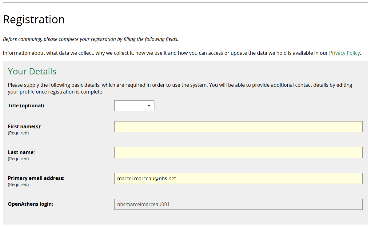 5. If the Member selects Complete your registration they are asked to supply their details. First name, last name and email address are required fields.