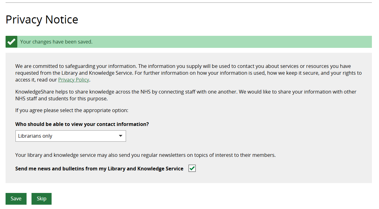 They have the option to change and Save their sharing and communication settings, or to Skip this page and keep the default settings.
