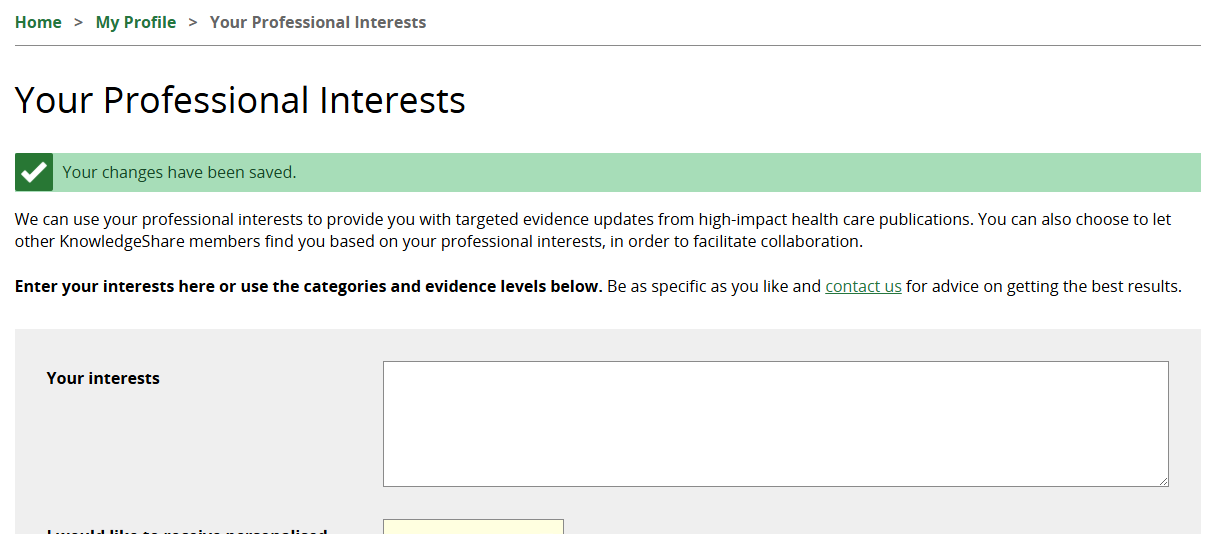 9. Member is taken to their Professional Interests page to request evidence updates if desired.