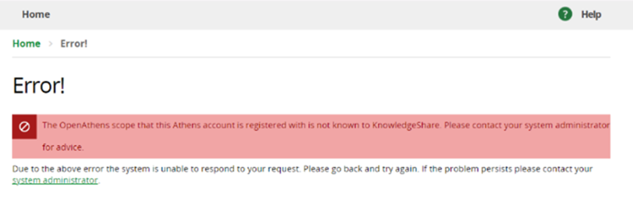 Occasionally a member sees the following error when logging in for the first time: The OpenAthens scope that this Athens account is registered with is not known to KnowledgeShare. Please contact your system administrator for advice.