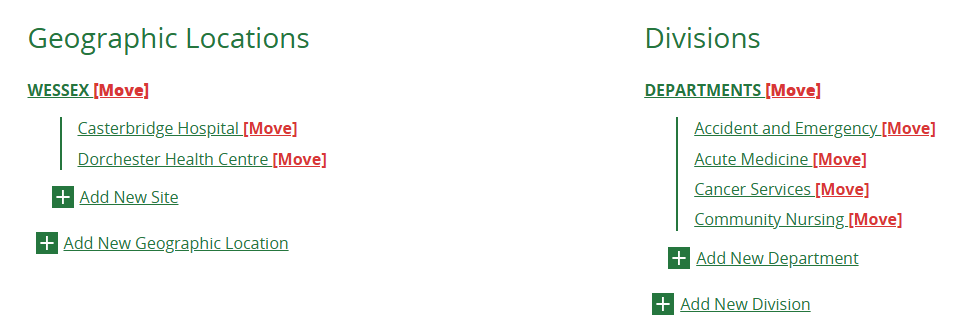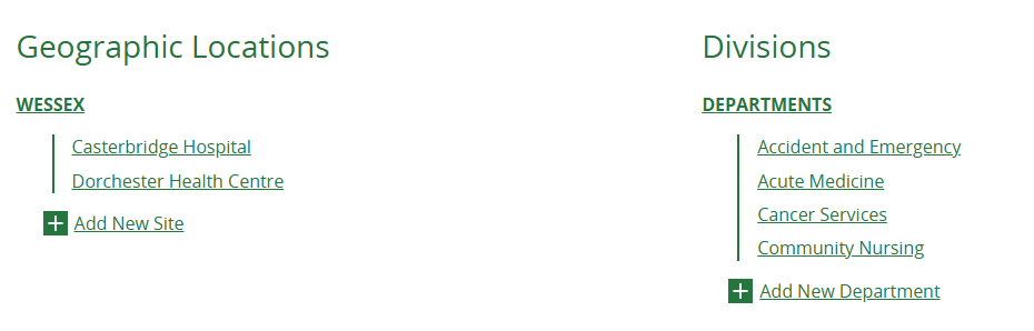 Only staff with LKS Administrator permissions who belong to the Organisation's Primary LKS can add, edit, and delete locations/sites and divisions/departments.