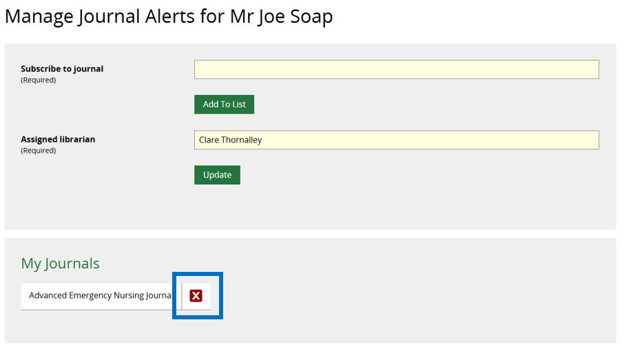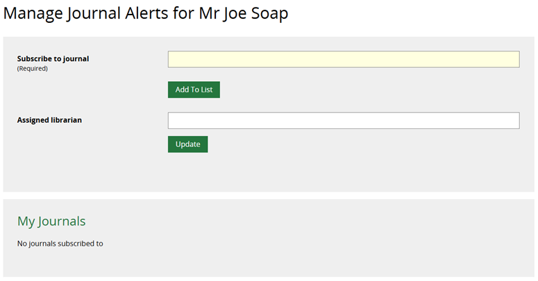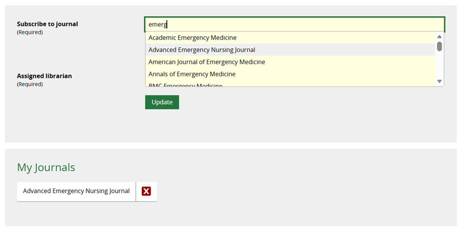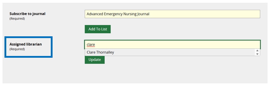 Add an Assigned Librarian in the field below and then click the Update button beneath it. This ensures that the ToC update is formatted as a personalised email from the member of staff responsible for that department within your team.