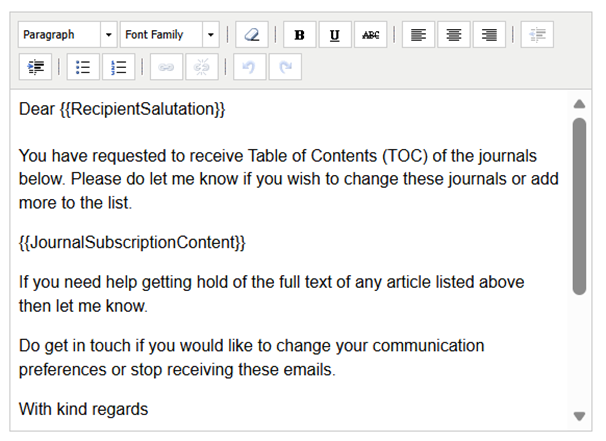 Current default email text for Journal ToC’s