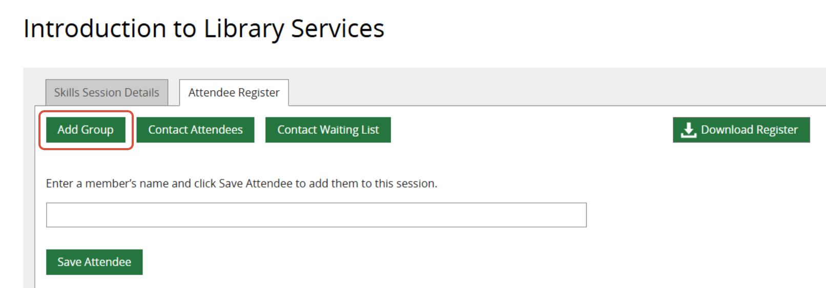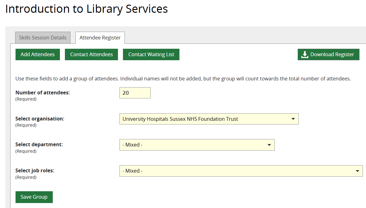 For inductions and other sessions where individual attendee names are not captured, staff can book a group of members on the session without creating individual member records on KnowledgeShare.