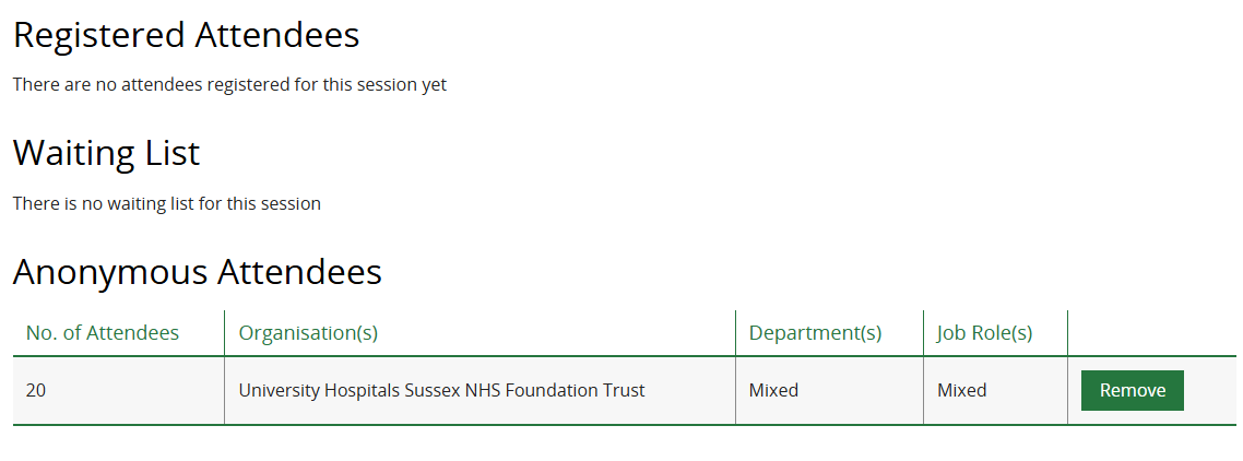 When a group has been booked on a session they will be displayed at the bottom of the screen under the heading Anonymous Attendees.