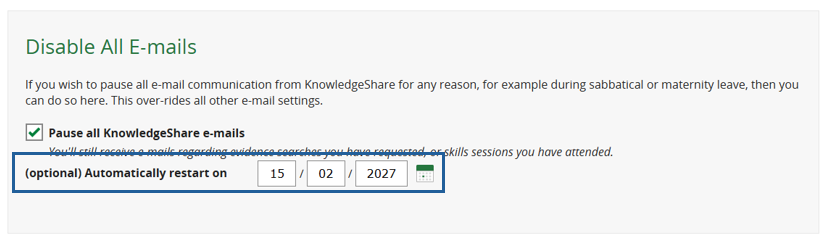 If you wish to pause all email communication from KnowledgeShare for any reason, for example during sabbatical or maternity leave, then you can use the ‘Pause all KnowledgeShare emails function.