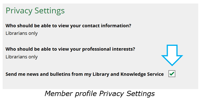 NOTE: To disable Newsletters from your service, uncheck the box next to Send me news and bulletins from my Library and Knowledge Service in the Privacy Settings of their member profile.