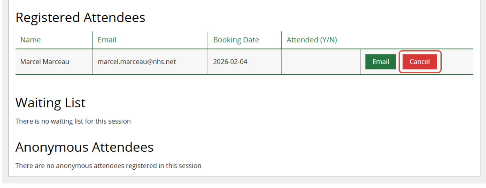 - In the Registered Attendees section, click Cancel next to the Member's name.